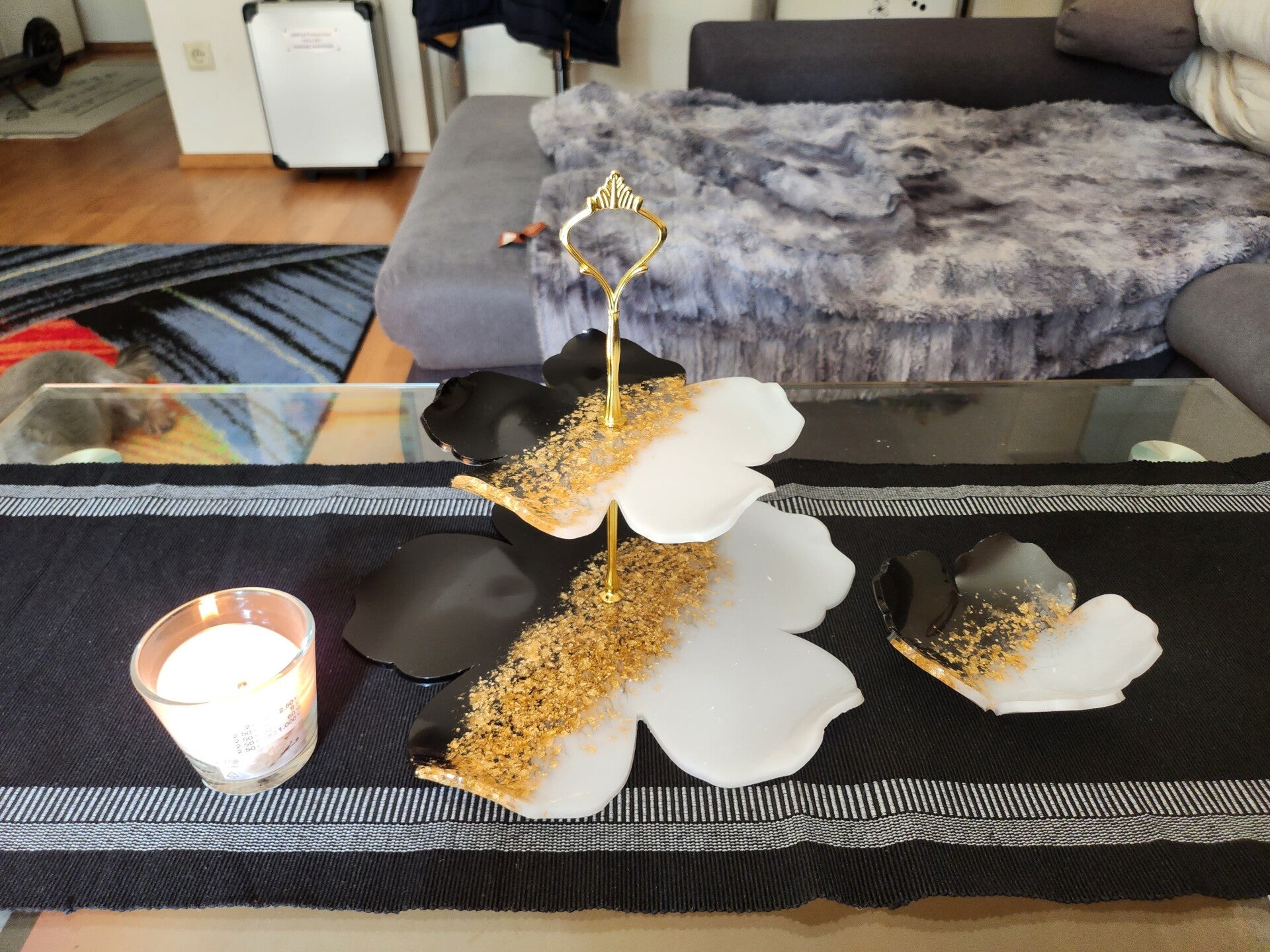 Etagere im Blumendesign in Schwarz/Weiß und Goldfluss mit dazupassender Schmuckschale in 20cm