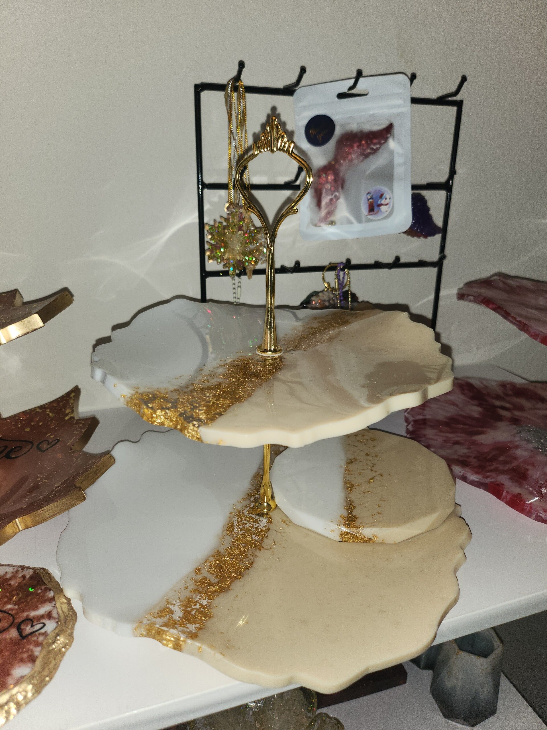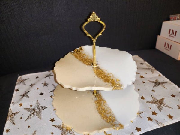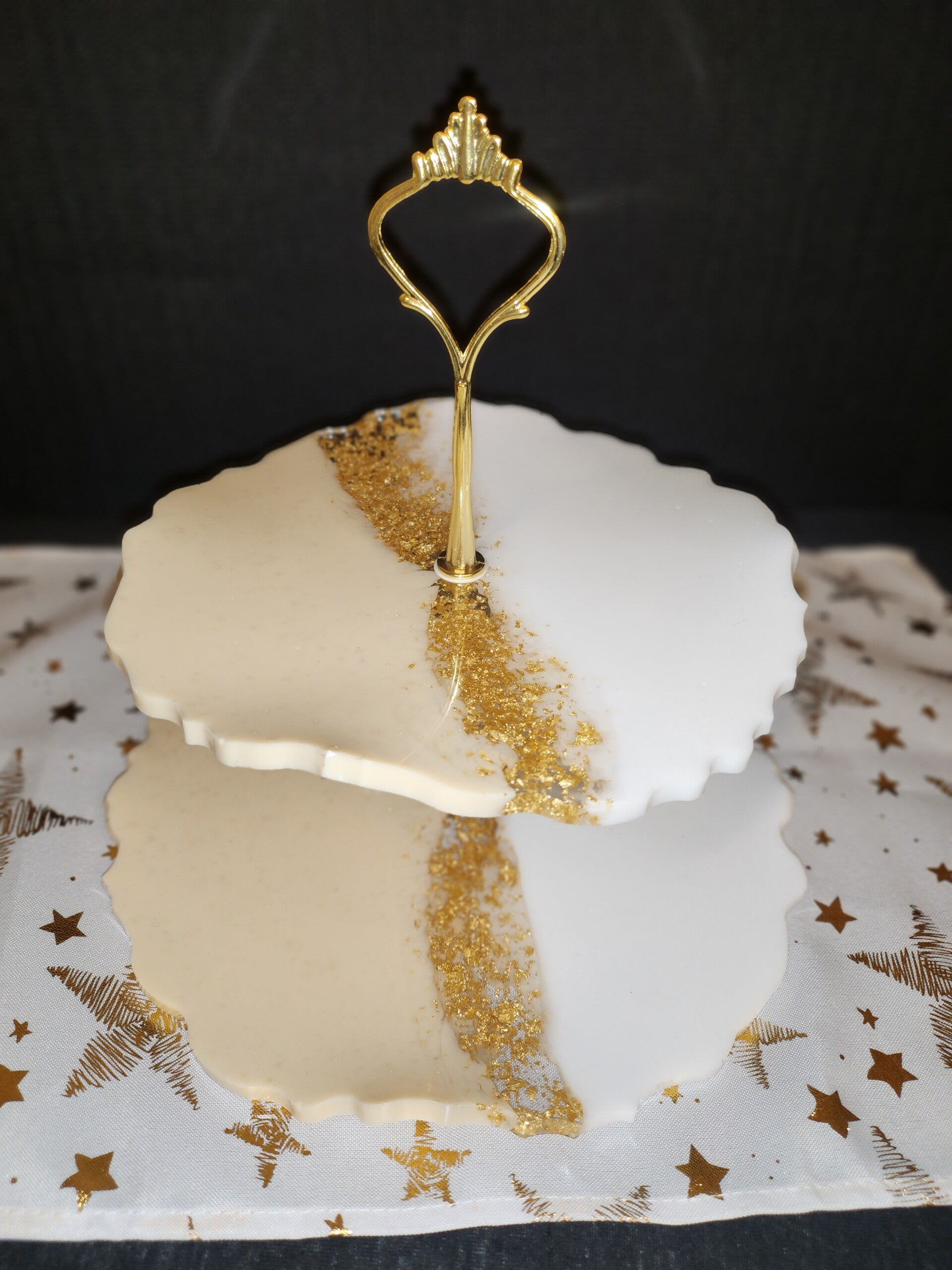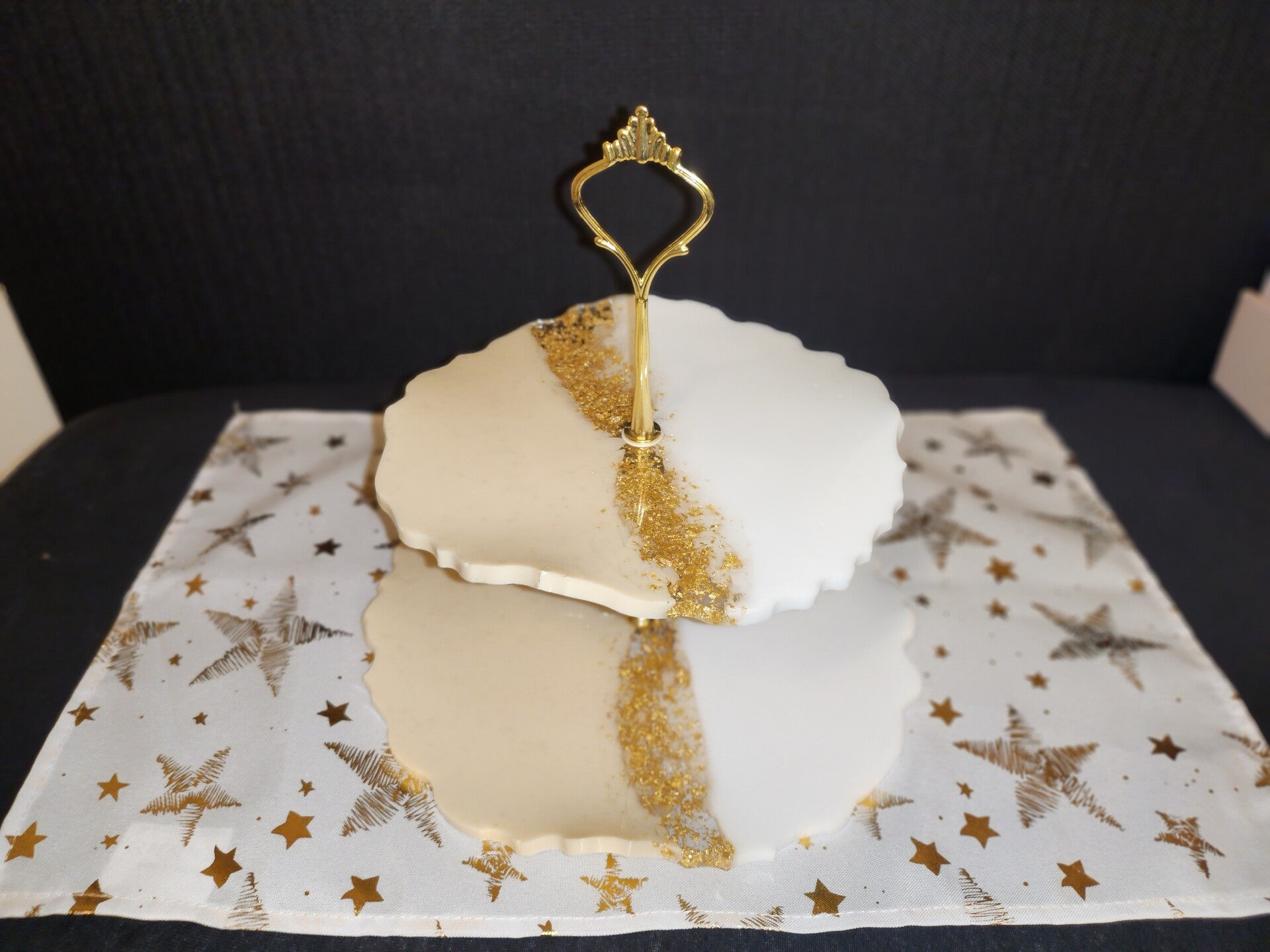 Etagere mit dazupassenden Unterseter als Set in Beige/Weiß mit Goldfluss und Goldstange