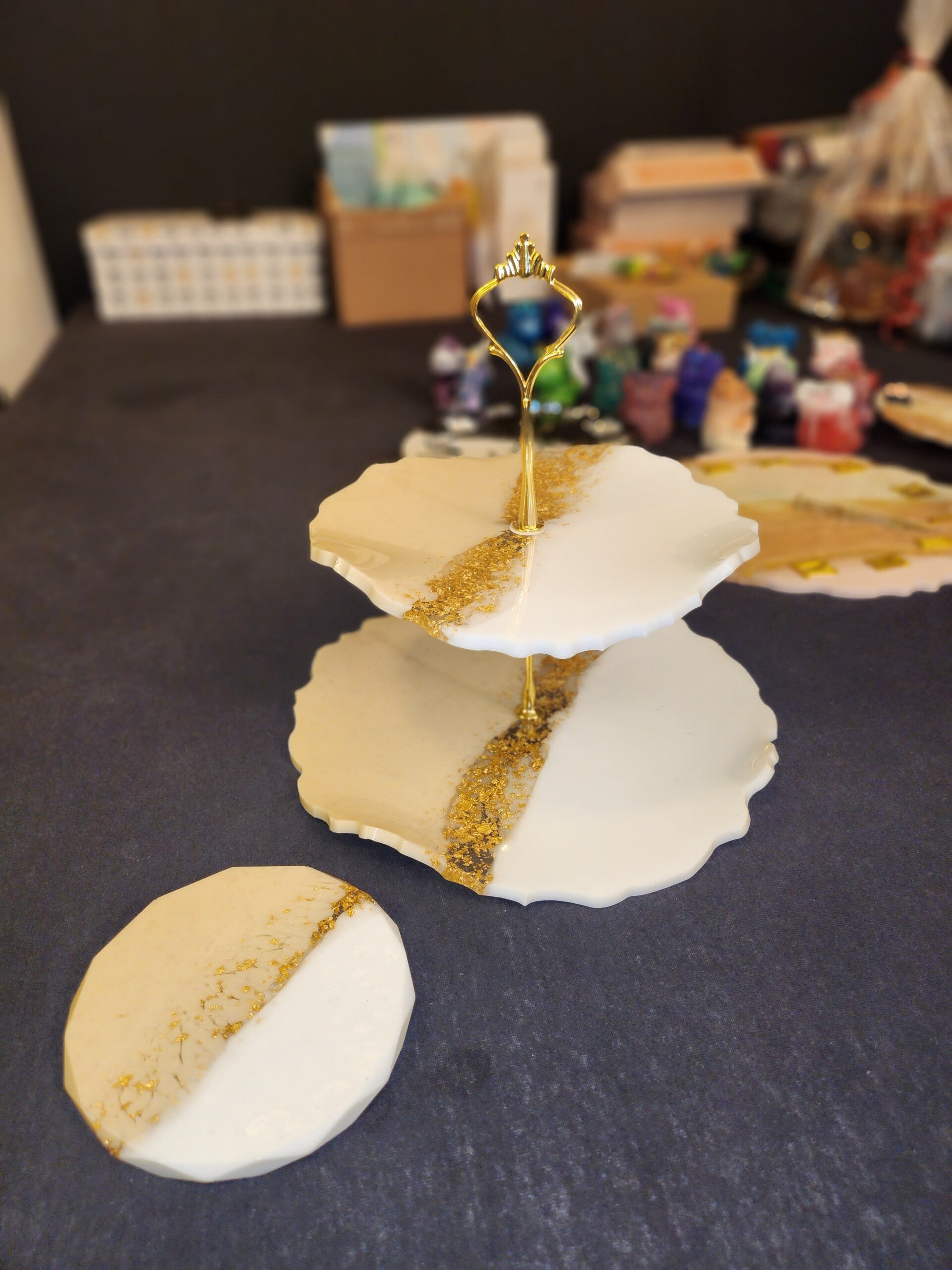 ETAGERE mit 2 Ablageschalen und dazupassenden Untersetzer in Beige/Weiß mit Goldfluss auf Wunsch mit Goldrand und