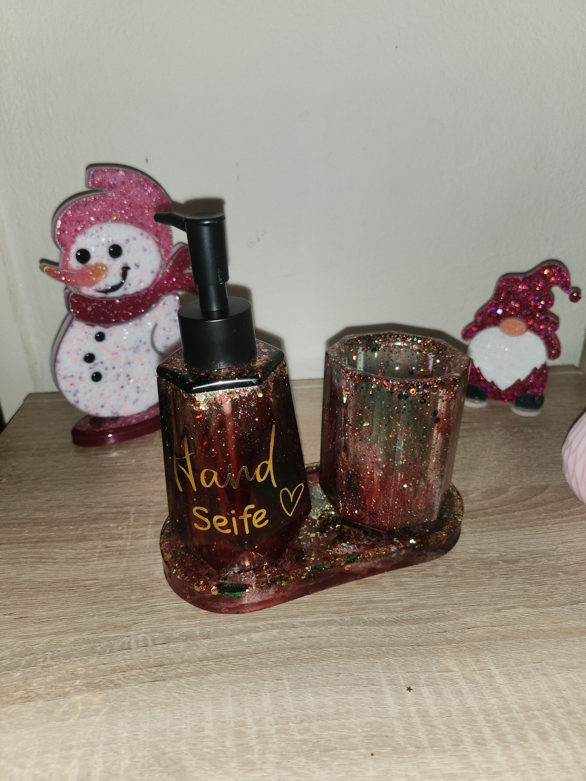 In Rot /Grün Glitzer bestehend aus Seifenspender Klein ,Zahnputzbecher klein und Tablett inkl Schriftzug